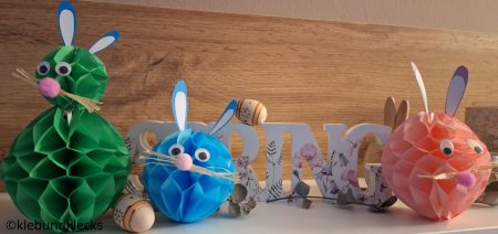TIPP: Solltest Du Wabenbälle in unterschiedlichen Größen zur Verfügung haben, könntest Du auch noch einen größeren als Hasenkörper am kleineren Kopf befestigen. Ob das Häschen dann noch Arme und Beine aus Buntpapier bekommt, liegt ganz bei Dir.